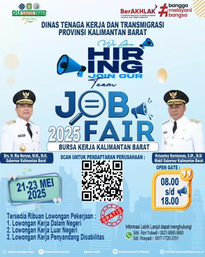 Dalam upaya mengatasi pengangguran dan mempertemukan pencari kerja dengan berbagai perusahaan ternama, Pemerintah Provinsi Kalimantan Barat kembali menggelar KALBAR NAKER FEST 2025. Kegiatan ini menjadi momentum strategis bagi masyarakat yang sedang mencari peluang kerja, dengan ribuan lowongan yang ditawarkan secara gratis melalui pameran job fair dan layanan ketenagakerjaan. Dinas Tenaga Kerja dan Transmigrasi Provinsi Kalimantan Barat akan menggelar KALBAR NAKER FEST 2025, sebuah pameran kesempatan kerja (job fair) dan layanan ketenagakerjaan terbesar di wilayah Kalimantan Barat.